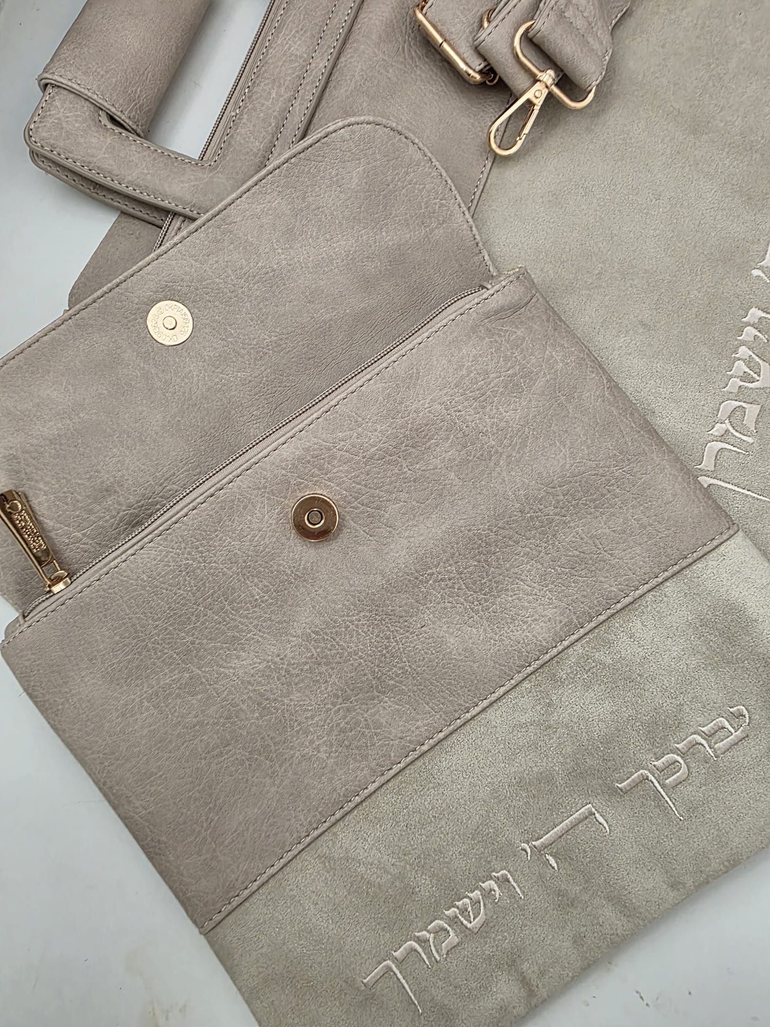 תיק לטלית ותפילין – יברכך קטיפה ודמוי עור בז'